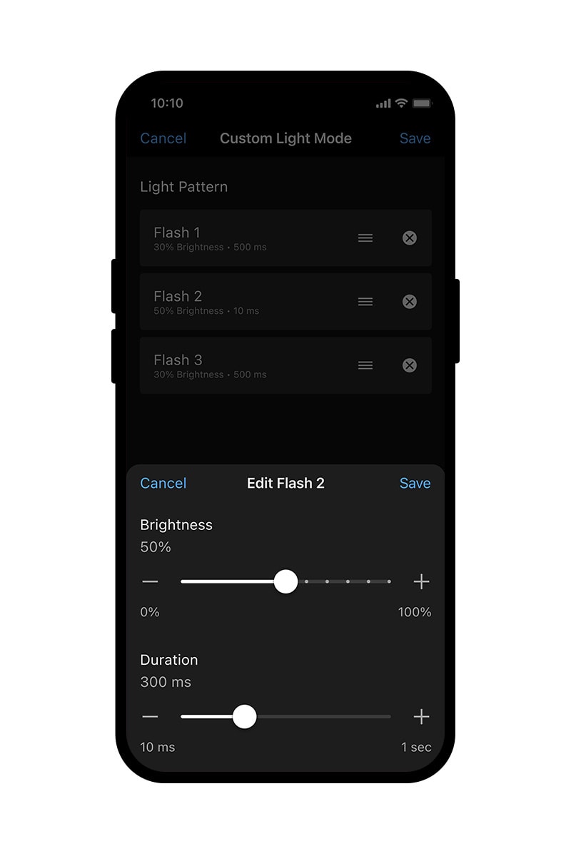 Korzystaj z czterech różnych trybów oświetlenia: migającego dziennego, migającego nocnego, ciągłego oraz trybu peletonu, który chroni wzrok kolarzy jadących za Tobą. Twórz własne, niestandardowe schematy oświetlenia w aplikacji Varia na smartfonie.